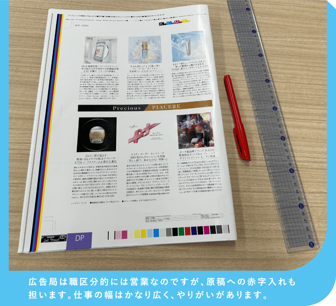 編集部と広告主の間に⼊り、雑誌に広告が掲載されるまでの調整役を担っています。タイトルは先輩社員の⽅からの受け売りになるのですが、広告の業務は多岐に渡り、⽇々の売り上げ管理から、広告案件の校了作業、またイベントの調整までが仕事となっています。そのため未だに知らないことが多く、⽇々勉強中です。